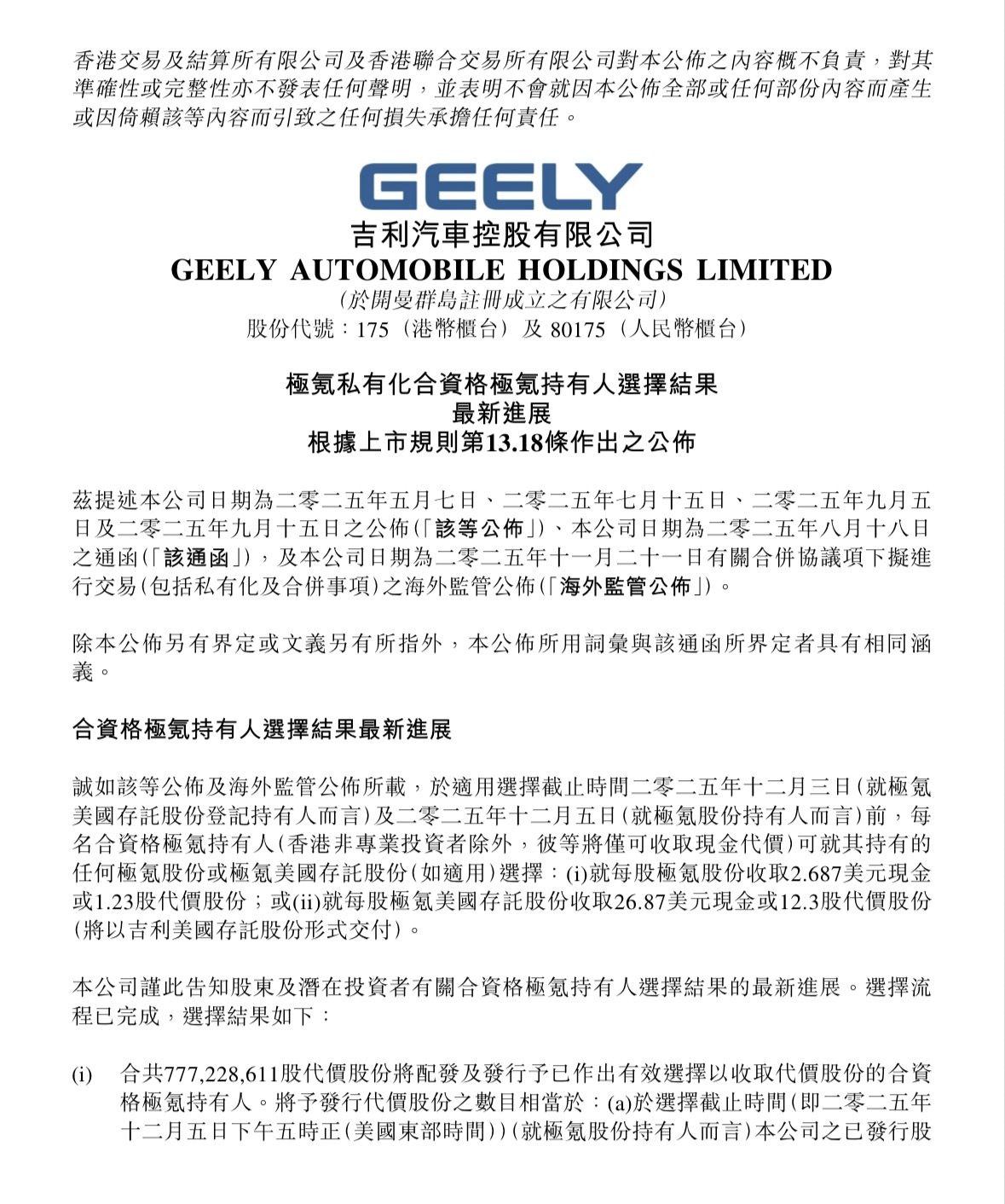 12月9日,祯祥汽车控股有限公司(0175.HK,以下简称“祯祥汽车”)发布公告,公布极氪智能科技控股有限公司(NYSE:ZK,以下简称“极氪”)特有化交游中捏有东说念主对价采用的最终散伙和落地决议,标识着纪念“一个祯祥”参预收官阶段。