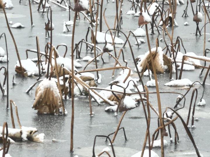 我穿戴这承载双重步地的大衣,沿湖碎步而行。眼神,则被湖心的时势深深攫住了。那满湖的夏莲,早已在风雪的严威下香消玉殒,可它们的残梗与残叶,仍然以一种倔强的姿态,根根片片挺立在冰湖上,搭起了大都不顺序的三角形与菱形。更有那瑟索的残叶,像半执的手掌,将飘落的飞雪,防备翼翼地捧在了掌心,在湖面上凝成大都杂沓有致的小雪团。远瞭望去,这哪是稀薄的冬日湖景?分明是秋天里丰充的棉花地,